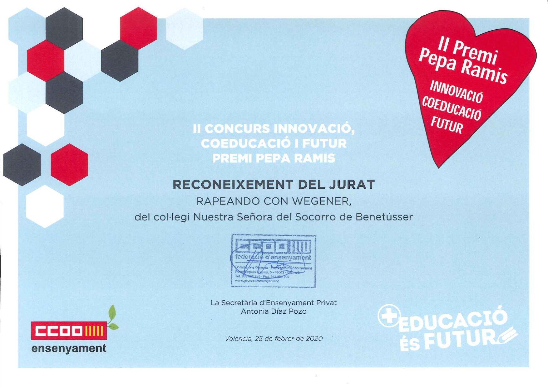 El pasado 25 de febrero un grupo de alumnos/as de 4 de ESO asistió a la entrega de premios del concurso "Coeducació, Innovació i Futur, Pepa Ramis" convocado por la Federació d'Ensenyament de CCOO. Nuestros alumnos al recoger la mención especial que nos había otorgado el jurado por nuestro proyecto: "Rapeando con Wegener", comentaron que les había gustado mucho la experiencia y animaban a otros centros a promover iniciativas de este tipo.
